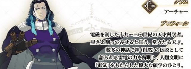 | プロフィール2 | 比類無き天才。現代のプロメテウス。 絶世の美男子。発明王エジソンの好敵手。 ゼウスの雷霆を地上に顕した男。 壮絶にして華麗なる叡智の魔人こそ、彼である。 マスターへの態度は尊大の一語。 |