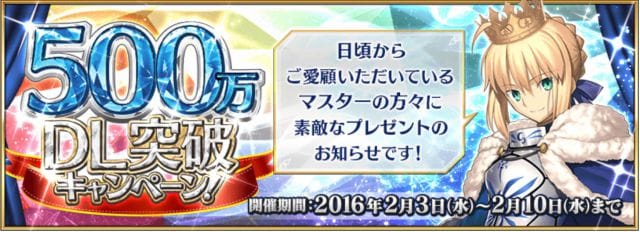 これからゲームを始める方に向け、スタートダッシュキャンペーンを大幅リニューアル。最大で聖晶石40個(レア召喚10回分)がもらえるほか、呼符3枚(レア召喚3回分)、経験値カード、フレンドポイント(召喚70回分)、黄金の果実(AP回復アイテム)などもゲットできます。500万DLキャンペーン中にゲームを開始すると、最大で合計24回分のレア召喚が行えます。