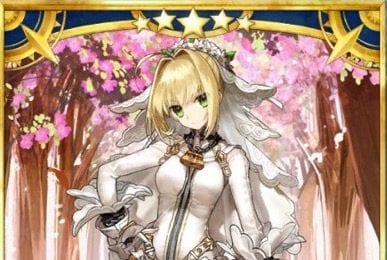 Fate/EXTRA CCCが初出の、「拘束の花嫁衣裳」を着たネロ・クラウディウス。FGOではレアリティに差があるものの、実際には着替えただけであり大きな変化はない。