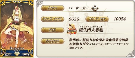| 味方単体の弱体解除 &HP回復(1000〜2500) &クリ威力アップ(1T/50〜100%) +味方単体〔酒呑童子〕の攻撃力アップ(3T/20〜30%) +味方に酒呑童子がいる時、自身のNPチャージ(20%) |