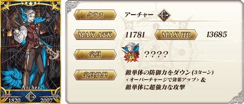 | 宝具 | 【 敵単体の防御力ダウン(3T/OC:20〜40%) &超強力な攻撃 |