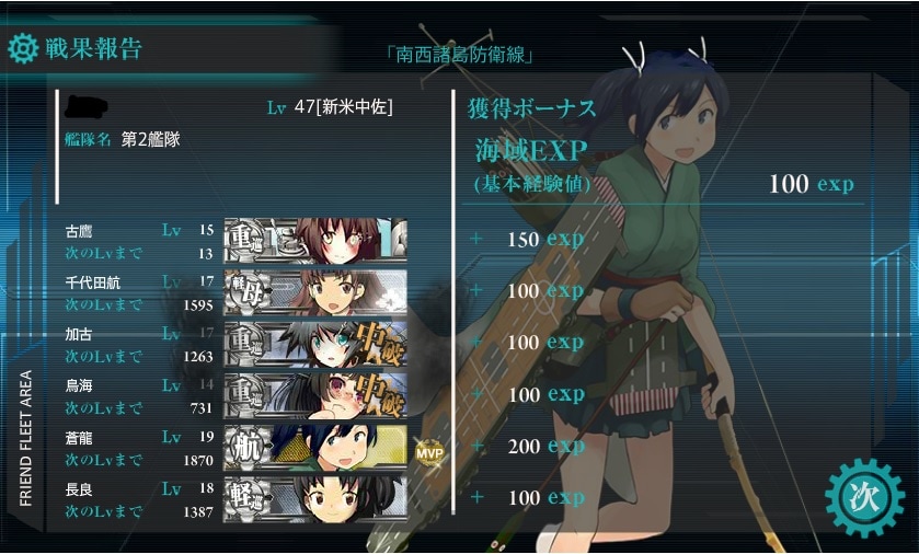 さらに1-2のボスで鳥海、1-3のボスで青葉、古鷹、加古、衣笠(いずれも重巡洋艦)をドロップするので手に入れましょう。残りを軽巡洋艦にして艦隊を組みます。
