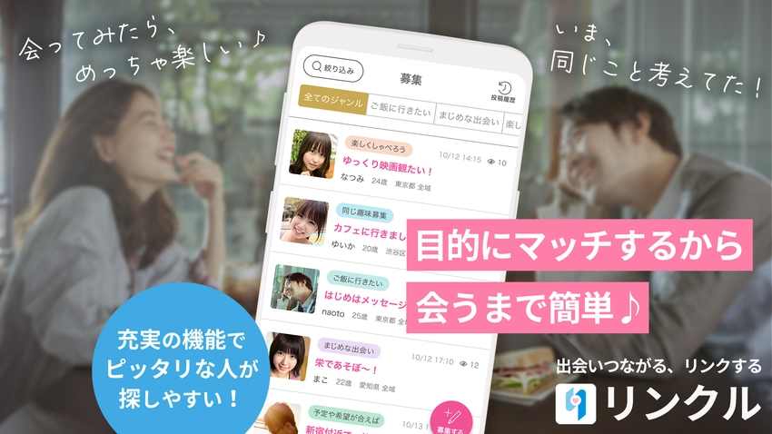 恋活・婚活・デート目的とさまざまな目的の人が集まるため見極めが肝心ですが、幅広いタイプの人と出会えます。ユーザーが多い分マッチングもしやすく、デートや連絡先の交換など発展に期待できます。