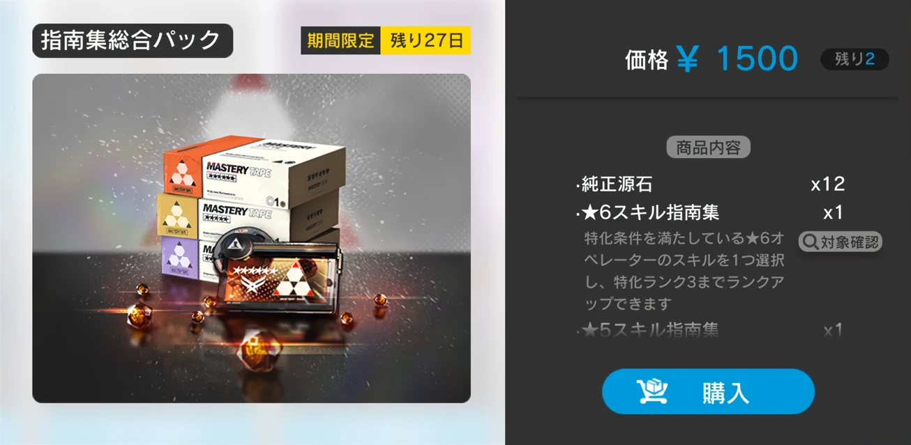 限定ガチャ期間中に2回まで購入することができるパックで、キャラのスキルレベルを特化3まで上げることができる指南書と純正源石が同梱されている。