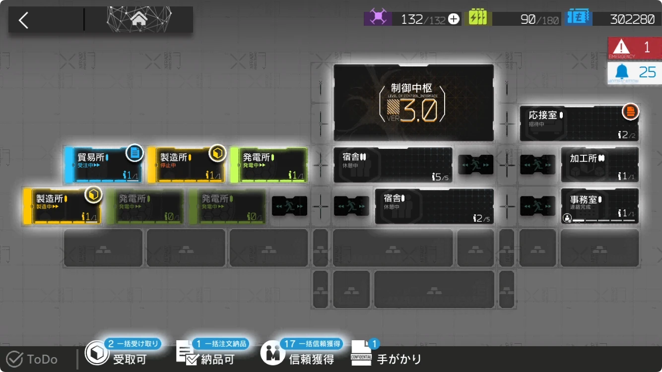 基地の「製造所」「貿易所」にキャラを配属して稼働させることで、龍門幣や作戦記録を生産することがでるので、青いベルマークが出ていたら忘れずに受け取ろう。