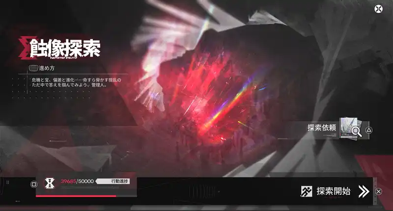 蝕像探索では、蝕像探索専用のエリアを探索して「密封源石の枝」や「オーリレン結晶」などの専用アイテムを回収することが目的となる。