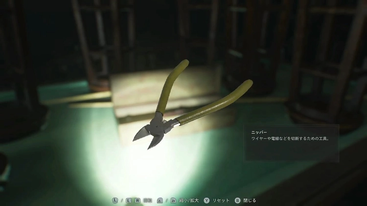 娯楽室のビリヤード台の上にある工具箱からニッパーを入手しよう。娯楽室奥の針金が巻かれた扉はニッパーを使うことで解錠可能。