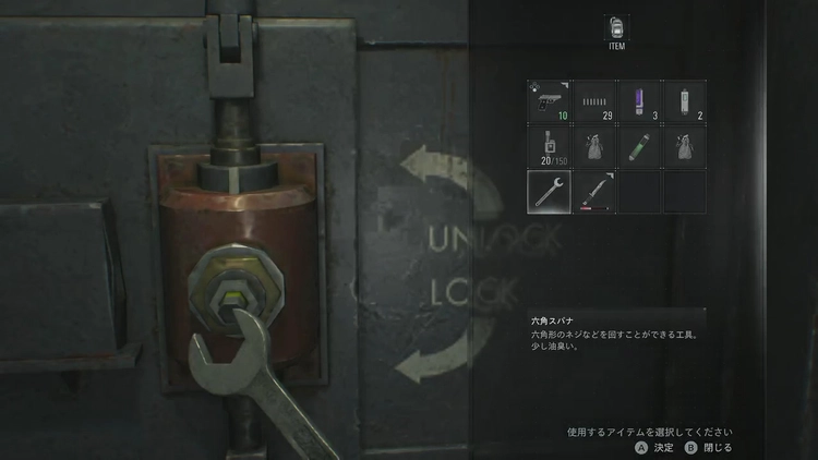 ガレージ手前にある管理人室に立ち寄り、六角スパナを入手する。管理人室にはセーブポイントやアイテムボックスがあるため、ガレージへ行く前にセーブをしておこう。