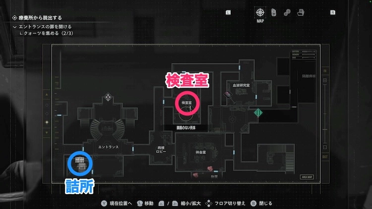 次の目的地は1階北東にある検査室。先程入手した人工心臓と臓器輸送ケースを持って向かおう。