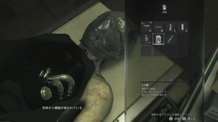 管理人室で入手した六角スパナを持って行き、1階北西にある冷凍庫を開けよう。冷凍庫には人工心臓があるため、忘れずに入手。