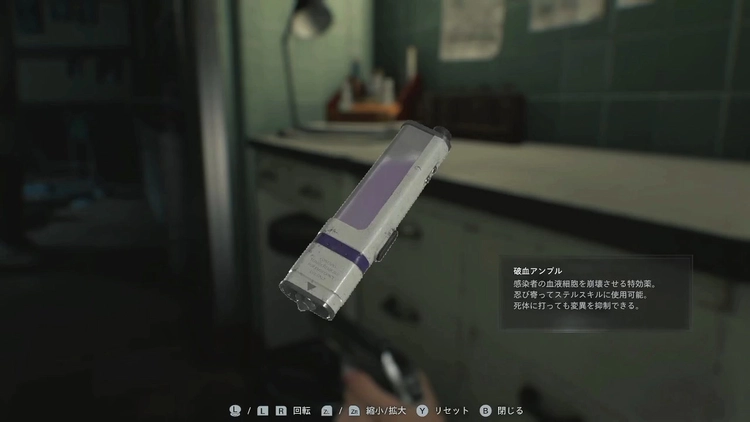 検査室にある破血アンプルは背後から近づいて使用すると、ゾンビを一撃で倒すことができる。