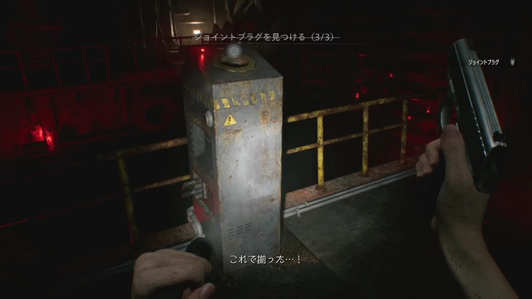 部屋の奥のフォークリフト付近にある分電盤にジョイントプラグが刺さっているので、回収して血溜に戻ろう。