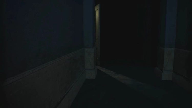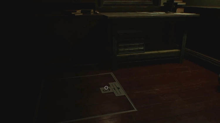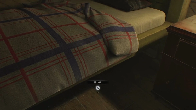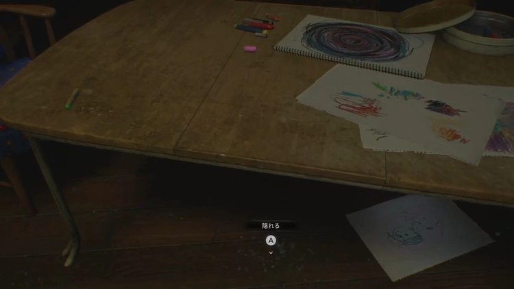 再び寝室を出て、まずは乳児室へ向かう。乳児室の奥の扉からホールへと行き、階段を降りた先にある机の下に隠れて待機しよう。