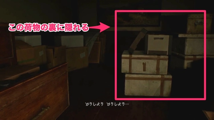 急いでタンス側へ引き返して、荷物の裏に隠れてやり過ごそう。