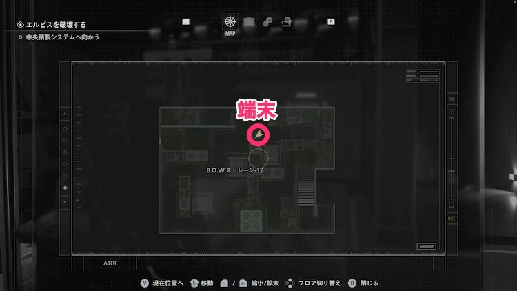 パワーユニットの奥にある赤色に光る端末を調べると、B.O.Wストレージ-12の地形が変わって奥へと進めるようになる。