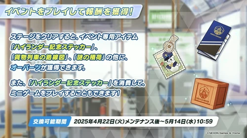 クエストで集めた素材「ハイランダー記念ステッカー」「貨物列車の路線図」、「謎の積荷」、はイベントのショップにて各種育成素材との交換が可能。