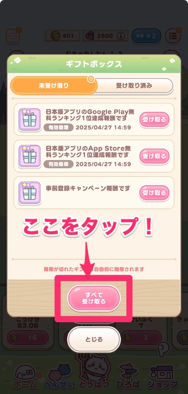 プレゼントは、メニュー画面のギフトボックスから受け取ることができる。