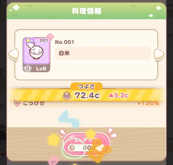 仲間になったちいかわたちは小さいアメを上げることでレベルを上げることができ、一定レベルまで上げると所持ボーナスを解放できる。