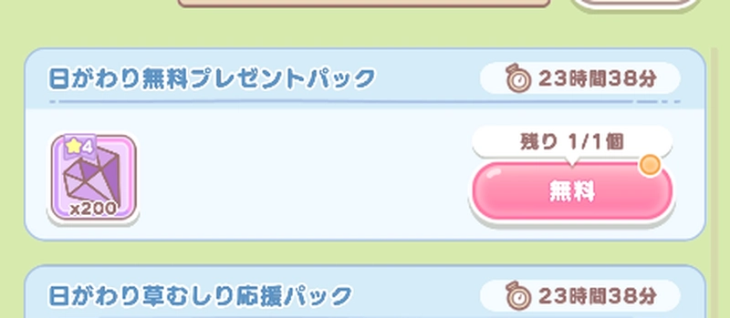 「ショップ」▶︎「ノーマル」▶︎「日がわり」の中にある『日がわり無料プレゼントパック』はその名の通り、毎日無料でアイテムをゲットすることができる。