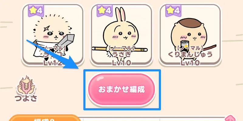 おまかせ編成は、キャラの性能関係なくレベルが高いキャラから順に編成するだけの機能。