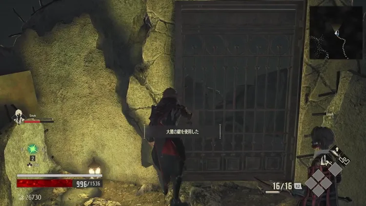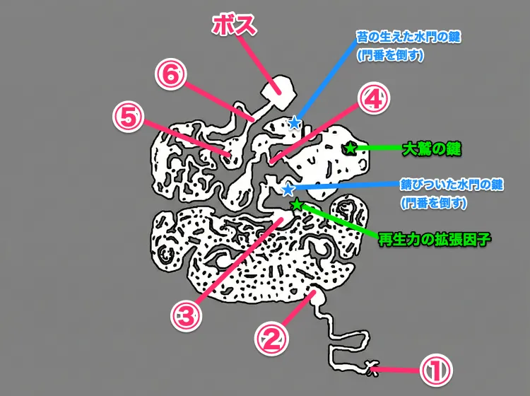 ・道中で「再生力の拡張因子」を回収 - 大鷲の鍵を入手して格子扉を開錠する・大鷲の鍵はマップ北東で拾う