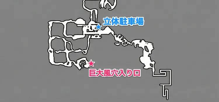市街地の南に巨大風穴の入り口があるので、立体駐車場のヤドリギから移動しよう。
