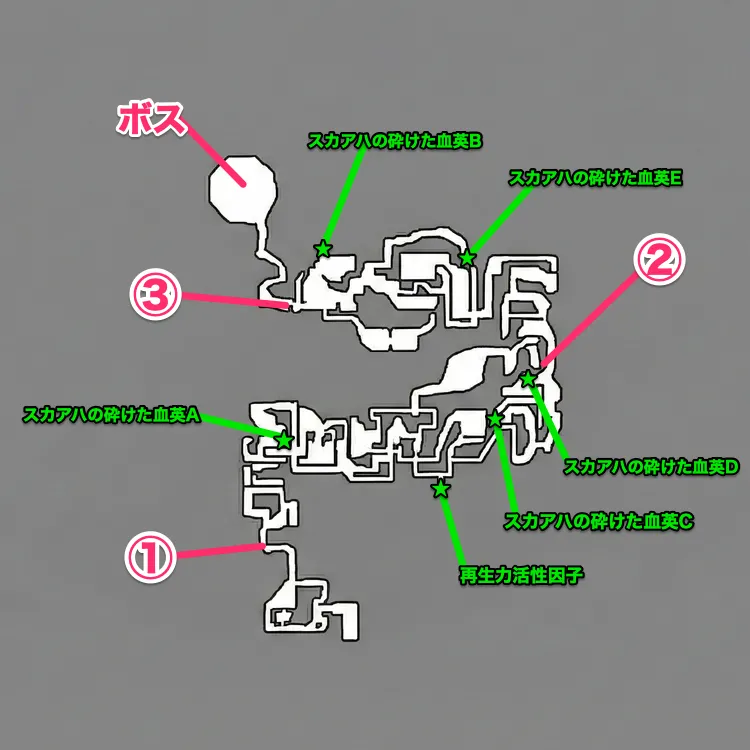 - 3分岐を西に進みスカアハの砕けた血英Bを回収