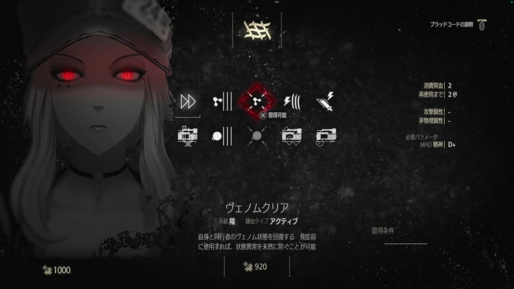 拠点の行商人「ココ」と話すと入手できるメルクリウスのブラッドコードには、ヴェノムへの耐性を上げる「ヴェノム耐性」やヴェノム状態を回復できる「ヴェノムクリア」がある。