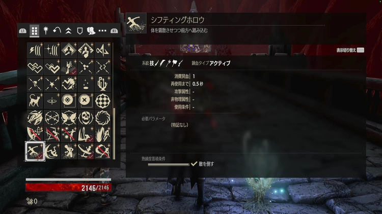 攻撃を避けやすくするためにシフティングホロウやバニシングホロウといった回避系の錬血を採用するのがおすすめ。
