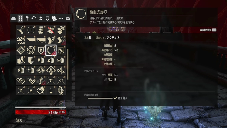 アトラースのブラッドコードにある「穢血の護り」は、同行者を含めたダメージ大幅軽減かつ再使用まで5秒と非常に強力。