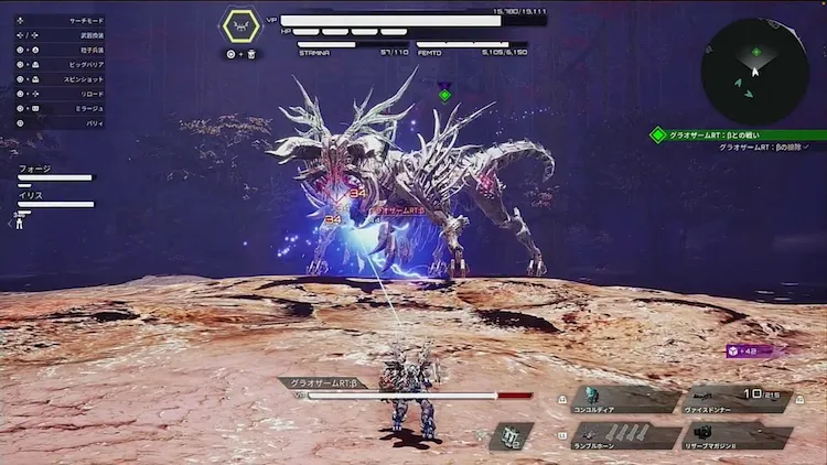 グラオザームRT:βは開幕から、大きな角を使って突進攻撃を行う。本体の攻撃には状態異常「帯電」の蓄積効果を持っているため、当たらないよう上空に逃げよう。