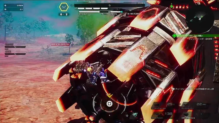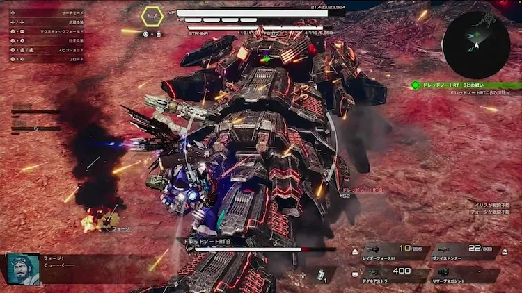 ドレッドノートRT:βは、頭部に4つ背中に4つ弱点であるコアが常に露出しているため、攻撃を弱点部位に集中させよう。