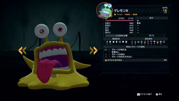 ![]() | 成熟期 軟体型 ウイルス 蛮勇 中 軟体 ステータス Lv 18 HP 2730 攻撃 844 防御 416 知力 614 精神 346 素早さ 441 種族耐性 ◯ △ - - - - - 属性耐性 ◯ - - - ◯ △ △ - - - - |