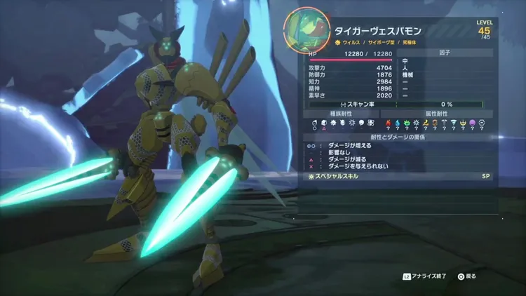 ![]() | 究極体 サイボーグ型 ウイルス 日和見 中 人 機械 ステータス Lv 45 HP 12280 攻撃 4704 防御 1876 知力 2984 精神 1896 素早さ 2020 種族耐性 ◯ △ - - - - - 属性耐性 - ◯ △ - ◯ - - △ - - - |