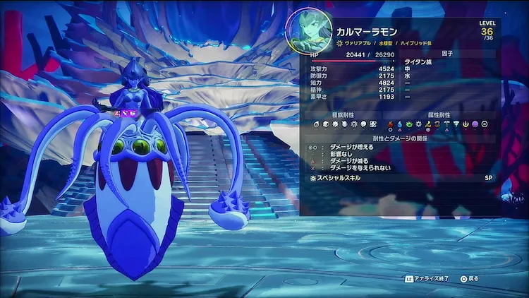 ![]() | 完全体 水棲型 データ 戦略家 ・水の因子に特攻を持つため、属性の弱点と合わせて大ダメージを狙える |