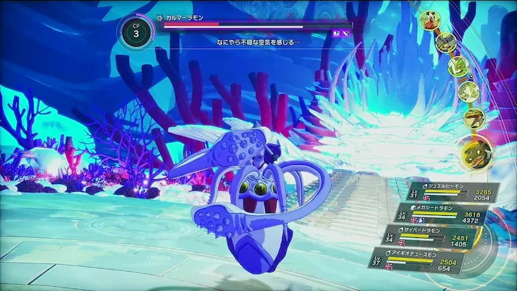 カルマーラモンは戦闘中にチャージ状態に移行することがある。チャージ中は「力を溜めている」の行動以外をしなくなるが、CPを増加させ能力を強化していく。