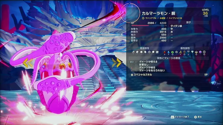特に雷属性の攻撃は2倍のダメージを与えられ、種族相性で有利を取れないヴァリアブル種族のカルマーラモン戦では積極的に雷弱点をついていきたい。
