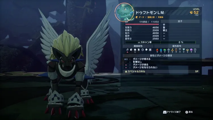 ![]() | 究極体 聖騎士型 データ 熱血 中 聖 騎士 ステータス Lv 52 HP 11050 攻撃 4656 防御 2009 知力 4656 精神 2009 素早さ 2560 種族耐性 △ - ◯ - - - - 属性耐性 - - - ◯ - ◯ △ - - - △ |