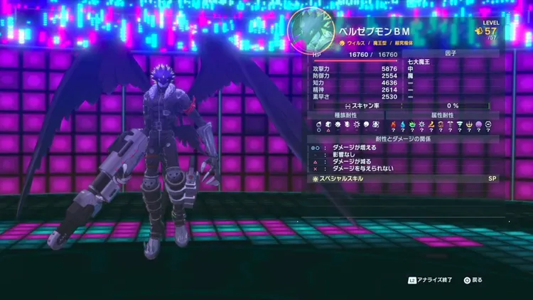 ![]() | 超究極体 魔王型 ウイルス 熱血 七大魔王 中 魔 ステータス Lv 57 HP 16760 攻撃 5876 防御 2554 知力 4636 精神 2614 素早さ 2530 種族耐性 ◯ △ - - - - - 属性耐性 △ - - - - ◯ - - ◯ △ - |