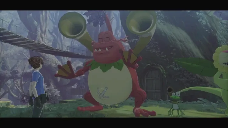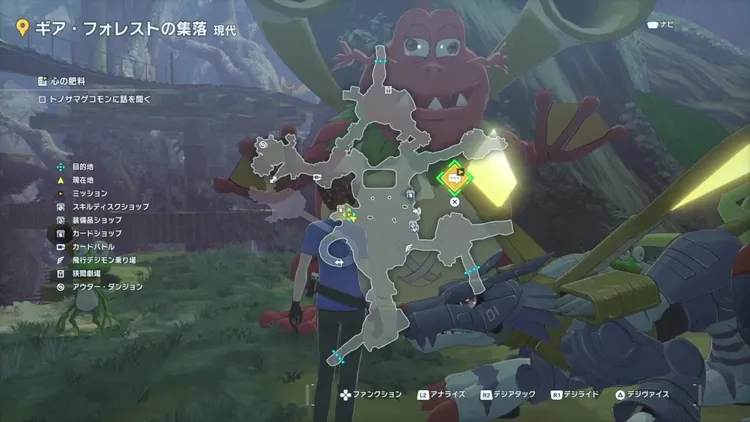 ギア・フォレストの集落 現代のマップ中央にいるトノサマゲコモンと会話しよう。