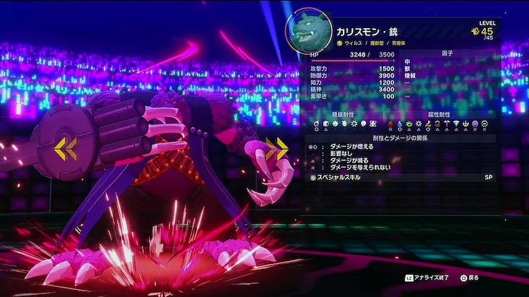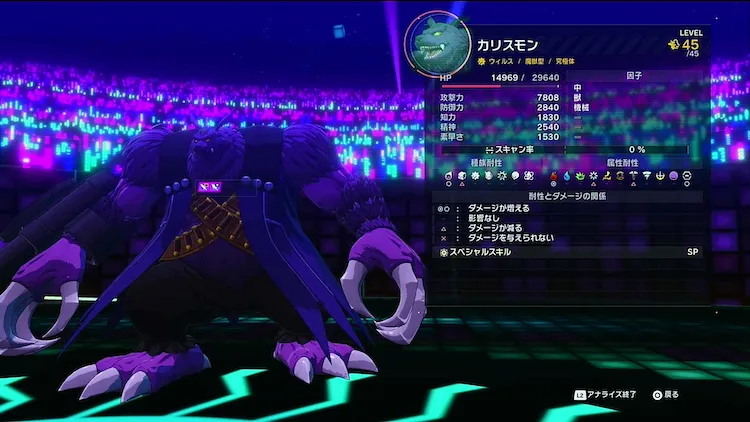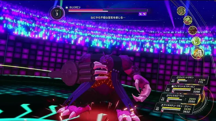 また、カリスモンは鋼、闇属性の攻撃を行ってくるため、鋼か闇に耐性のあるデジモンを編成すると攻略が楽になる。
