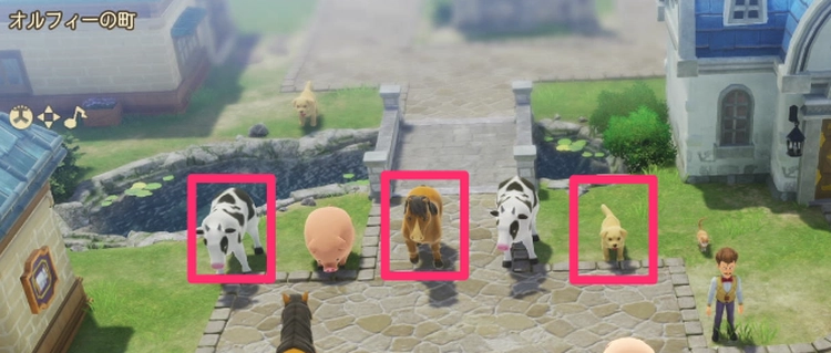 犬、馬、左側にいる牛に話しかけるとイベントをクリア。