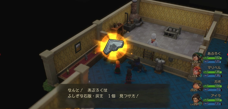 じゅうたんで到着後、ブルジオの屋敷に入ると1階に「ふしぎな石板・灰」があるので回収しよう。