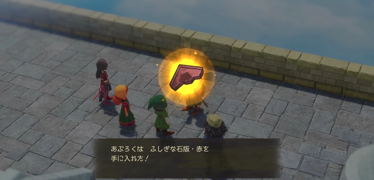仲間に加入する際に、メルビンから「ふしぎな石板・赤」が貰える。
