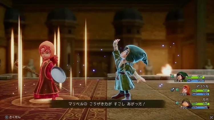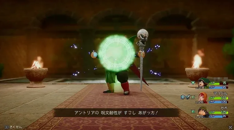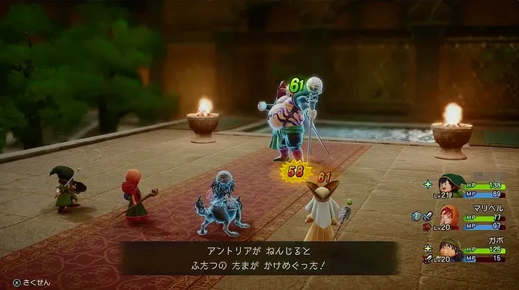 アントリアに対して、主人公が習得している技の中に有効なものは少ない。基本は他キャラのサポートに回り、敵が呪文耐性を上げてきたタイミングでは、マリベルがサポートに回って攻撃するのがいいだろう。