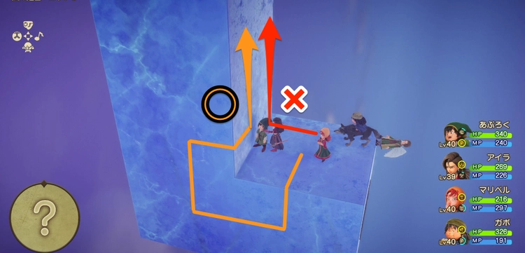 壁のようになっている直角90°には進めないので、横から回り込む形で移動していこう。