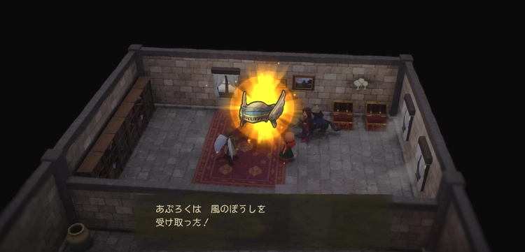 ボス撃破後に族長の家に訪れて、全てのツボを割った状態で話しかけると「風のぼうし」が貰える。