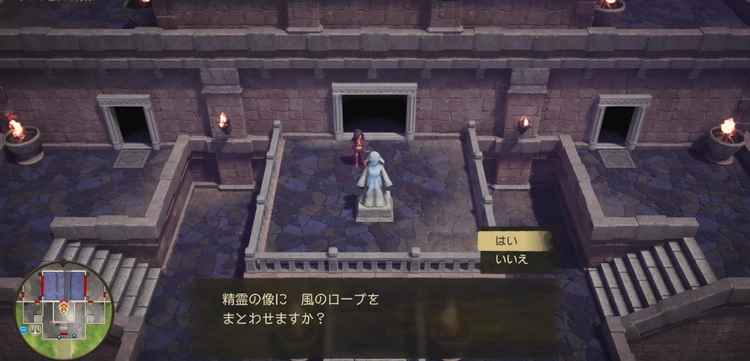 東の通路から4階に入り、中央の通路から外に出た先にいる女神像を調べて風のローブを渡せばOK。