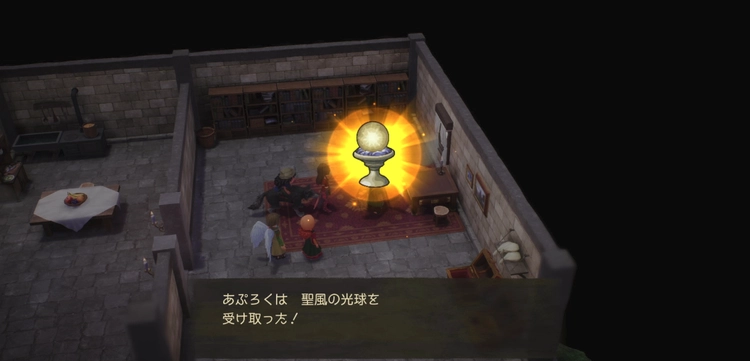 家を出ようとすると止められるので、もう一度族長に話しかけて「聖風の光球」を受け取ろう。
