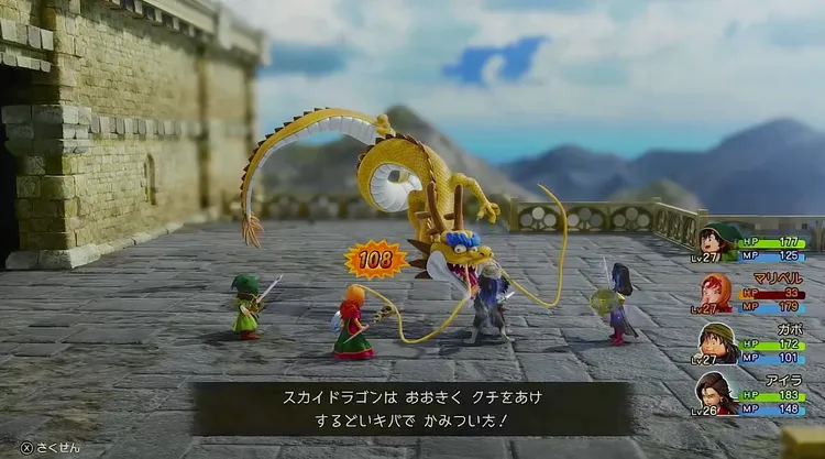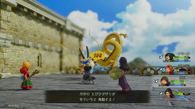 スカイドラゴンは、ヒャド系以外に有効な呪文がなく、呪文ではダメージを与えにくい。ただし、スカイドラゴンは飛行しているドラゴン系の敵のため、「とびひざげり」や「ドラゴン斬り」が有効だ。